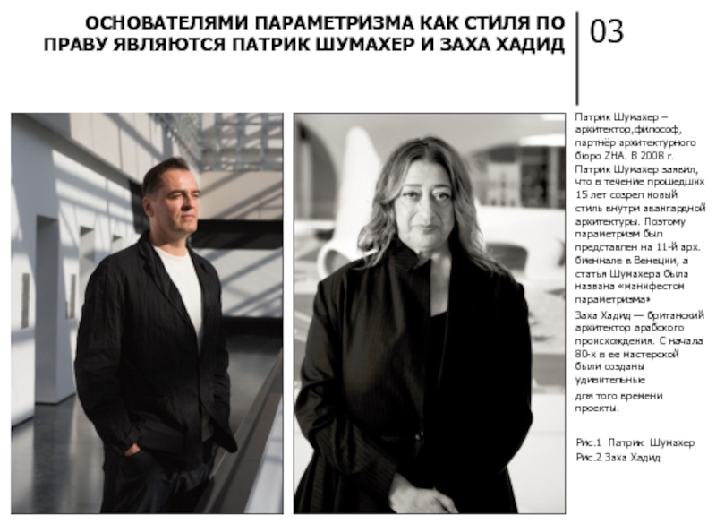 ОСНОВАТЕЛЯМИ ПАРАМЕТРИЗМА КАК СТИЛЯ ПО ПРАВУ ЯВЛЯЮТСЯ ПАТРИК ШУМАХЕР И ЗАХА ХАДИД