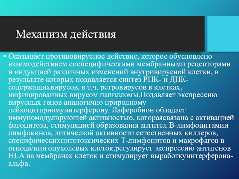 синтез РНК- и ДНК-содержащихвирусов, в т.ч. ретровирусов в клетках, инфицированных вирусом папилломы.Подавляет экспрессию вирусных генов аналогично природному лейкоцитарномуинтерферону. Лаферобион обладает иммуномодулирующей активностью, котораясвязана с активацией фагоцитоза, стимуляцией образования антител В-лимфоцитамии лимфокинов, литической активности естественных киллеров, специфическихцитотоксических Т-лимфоцитов и макрофагов в отношении опухолевых клеток,регулирует экспрессию антигенов HLA на мембранах клеток и стимулирует выработкуинтерферона-альфа.