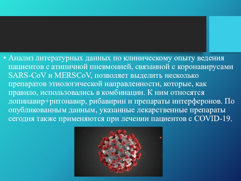 препаратов этиологической направленности, которые, как правило, использовались в комбинации. К ним относятся лопинавир+ритонавир, рибавирин и препараты интерферонов. По опубликованным данным, указанные лекарственные препараты сегодня также применяются при лечении пациентов с COVID-19.