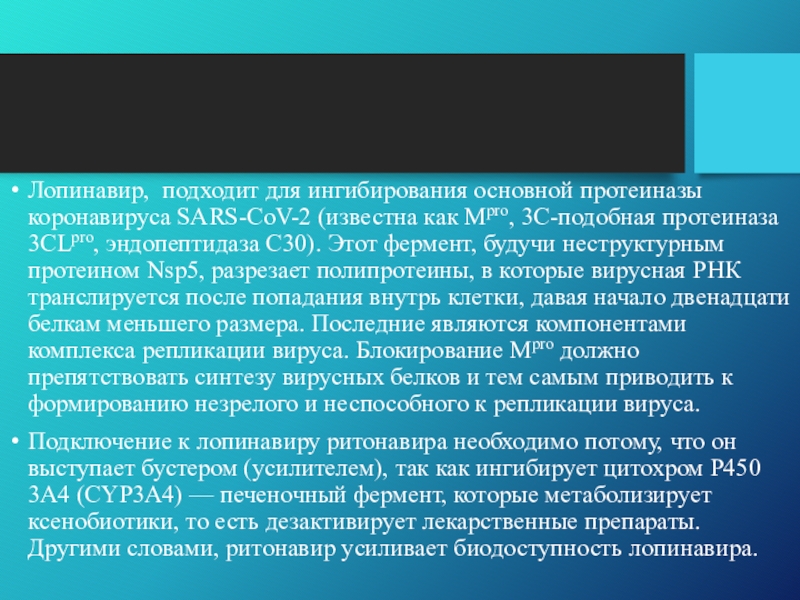 Слайд 5Лопинавир, подходит для ингибирования основной протеиназы коронавируса SARS-CoV-2 (известна как Mpro,