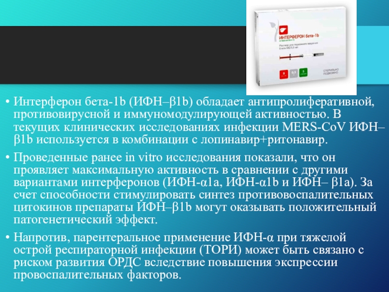 Слайд 8Интерферон бета-1b (ИФН–β1b) обладает антипролиферативной, противовирусной и иммуномодулирующей активностью. В