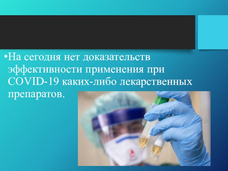 Слайд 2На сегодня нет доказательств эффективности применения при COVID-19 каких-либо лекарственных