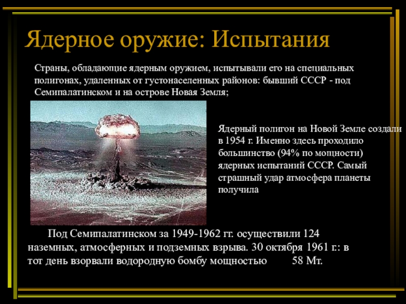Первая Советская атомная бомба была взорвана в 1949 году близ города Семипалатинска (Казахстан).