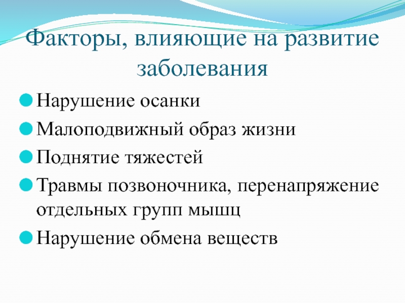Факторы, влияющие на развитие заболеванияНарушение осанки Малоподвижный образ жизни Поднятие тяжестейТравмы позвоночника, перенапряжение отдельных групп мышцНарушение обмена