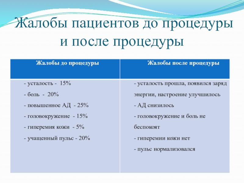 Слайд 21Жалобы пациентов до процедуры и после процедуры