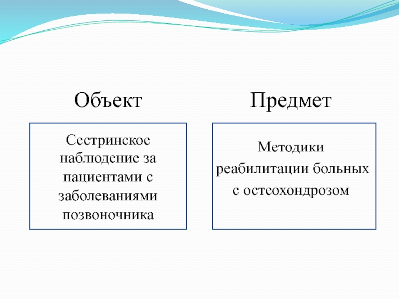 ОбъектПредметМетодики реабилитации больных с остеохондрозомСестринское наблюдение за пациентами с заболеваниями позвоночника