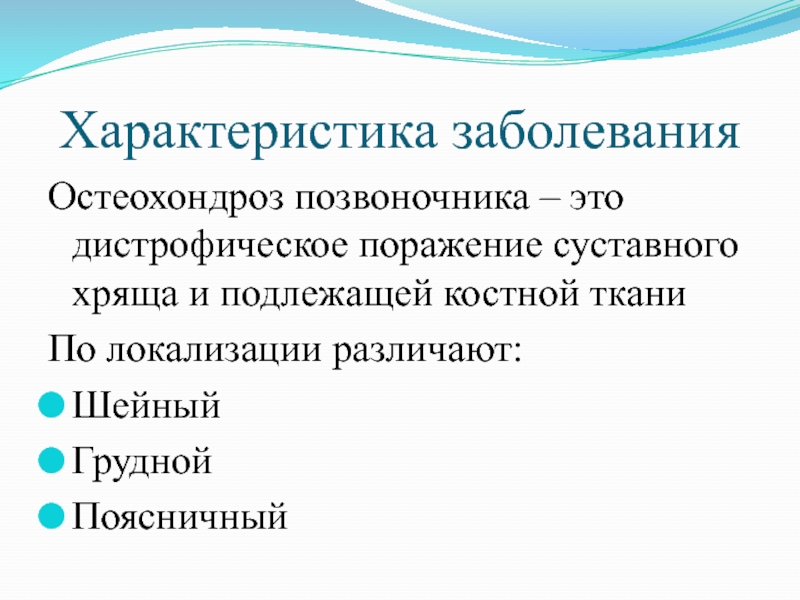 Характеристика заболеванияОстеохондроз позвоночника – это дистрофическое поражение суставного хряща и подлежащей костной тканиПо локализации различают:Шейный ГруднойПоясничный