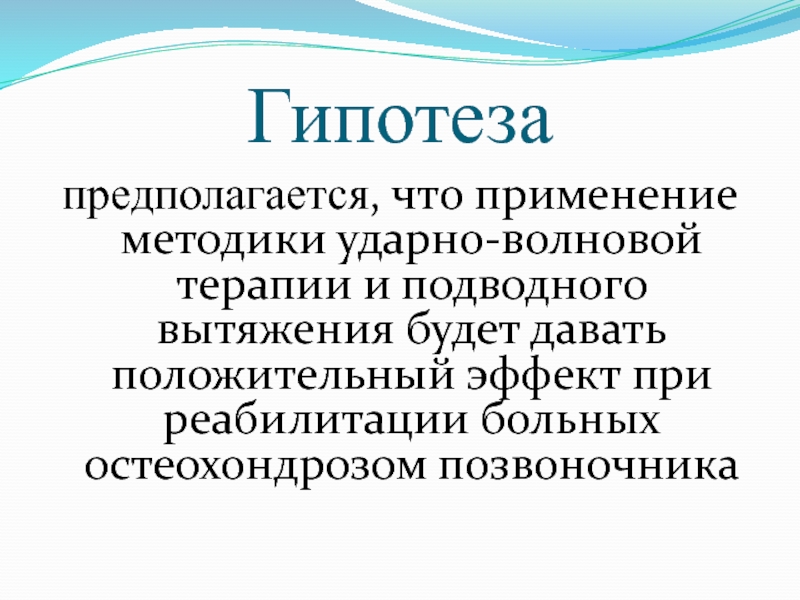 Гипотезапредполагается, что применение методики ударно-волновой терапии и подводного вытяжения будет давать положительный эффект при реабилитации больных остеохондрозом