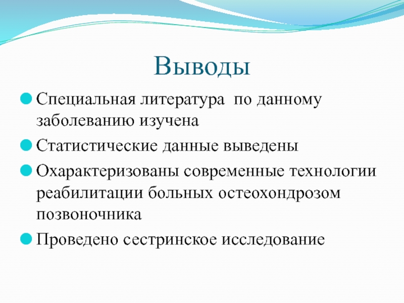 ВыводыСпециальная литература по данному заболеванию изученаСтатистические данные выведеныОхарактеризованы современные технологии реабилитации больных остеохондрозом позвоночникаПроведено сестринское исследование