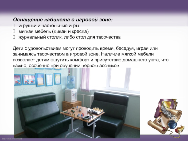 проводить время, беседуя, играя или занимаясь творчеством в игровой зоне. Наличие мягкой мебели позволяет детям ощутить комфорт и присутствие домашнего уюта, что важно, особенно при обучении первоклассников.