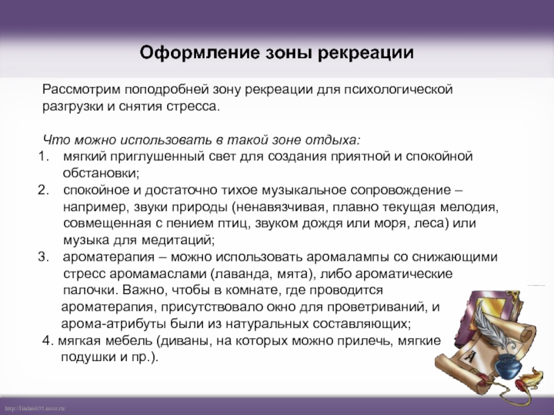 Рассмотрим поподробней зону рекреации для психологической разгрузки