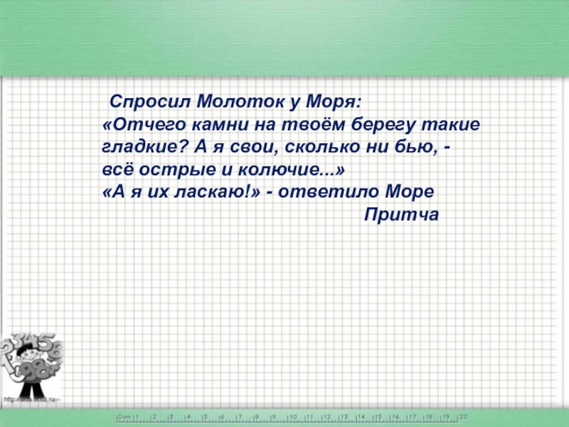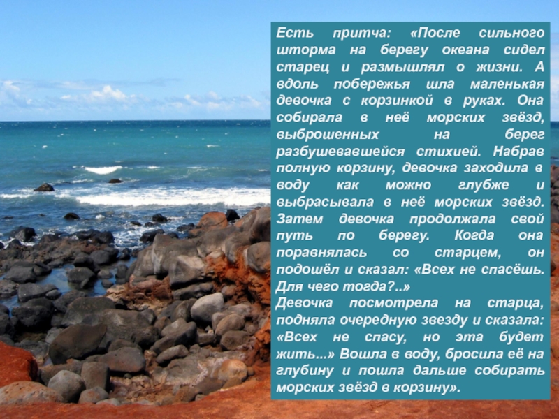Слайд 19Есть притча: «После сильного шторма на берегу океана сидел старец