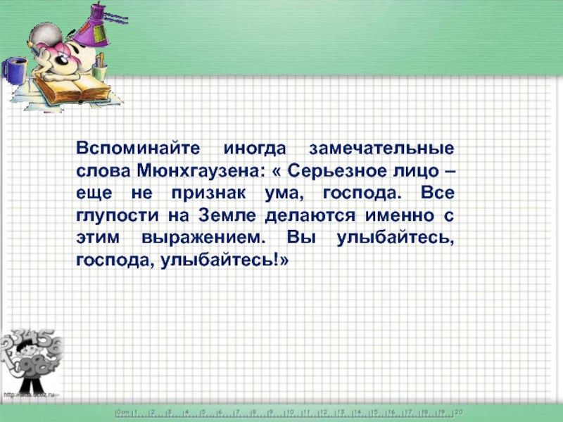 Слайд 24Вспоминайте иногда замечательные слова Мюнхгаузена: « Серьезное лицо – еще