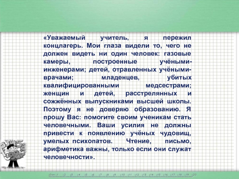 Слайд 12«Уважаемый учитель, я пережил концлагерь. Мои глаза видели то, чего