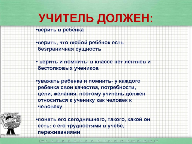 ребенка и помнить- у каждого ребенка свои качества, потребности, цели, желания, поэтому учитель должен относиться к ученику как человек к человеку