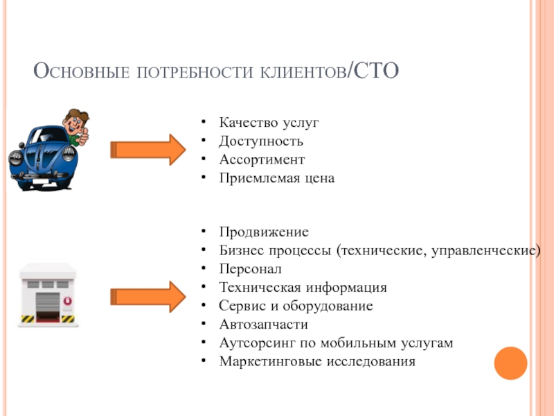 Основные потребности клиентов/СТОКачество услугДоступностьАссортиментПриемлемая ценаПродвижениеБизнес процессы (технические, управленческие)ПерсоналТехническая информацияСервис и оборудованиеАвтозапчастиАутсорсинг по мобильным услугамМаркетинговые исследования