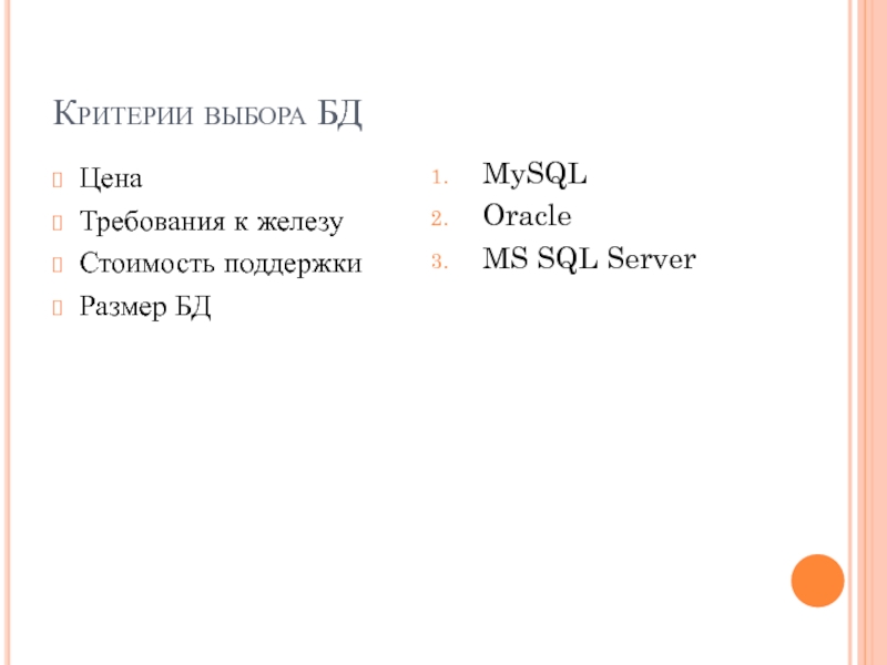 Критерии выбора БДЦенаТребования к железуСтоимость поддержкиРазмер БДMySQLOracleMS SQL Server