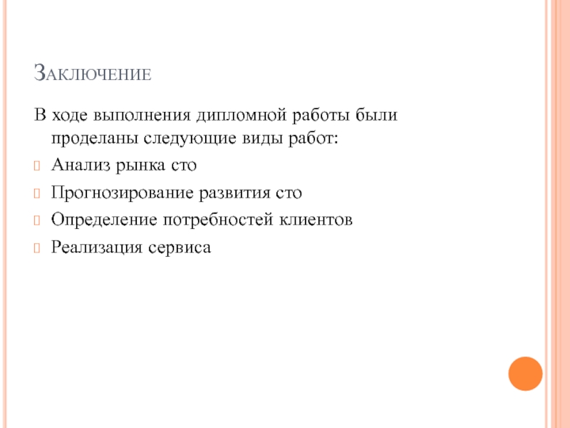 ЗаключениеВ ходе выполнения дипломной работы были проделаны следующие виды работ:Анализ рынка стоПрогнозирование развития стоОпределение потребностей клиентовРеализация сервиса