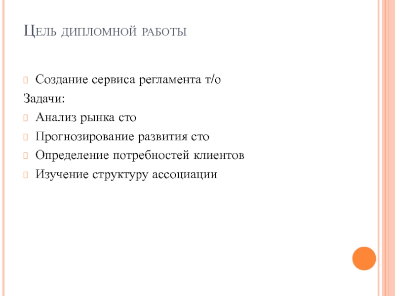 Цель дипломной работы Создание сервиса регламента т/оЗадачи:Анализ рынка стоПрогнозирование развития стоОпределение потребностей клиентовИзучение структуру ассоциации