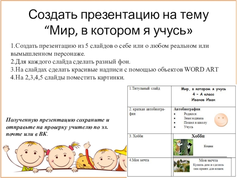 Полученную презентацию сохраните и отправьте на проверку учителю по эл.почте или в ВК.
