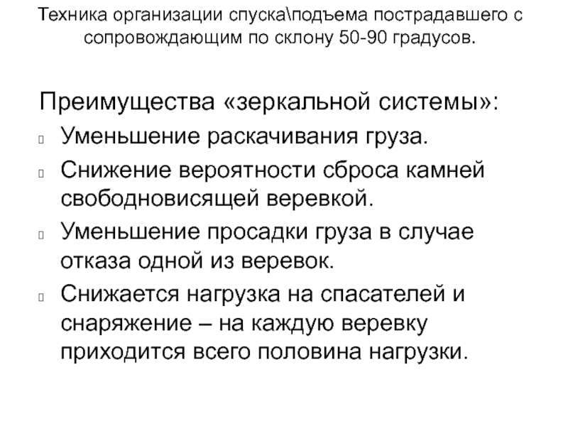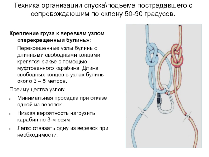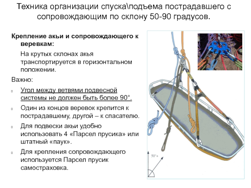 Техника организации спуска\подъема пострадавшего с сопровождающим по склону 50-90 градусов.