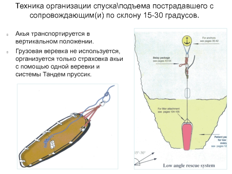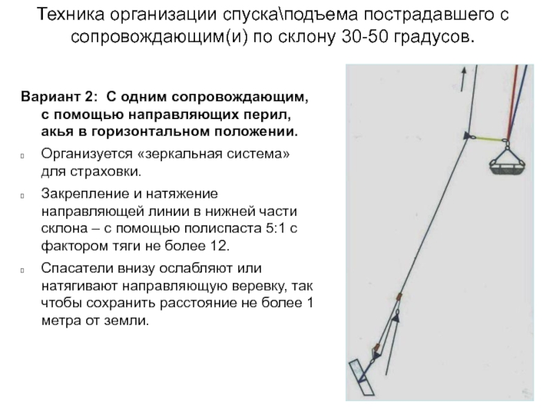 Техника организации спуска\подъема пострадавшего с сопровождающим(и) по склону 30-50 градусов.