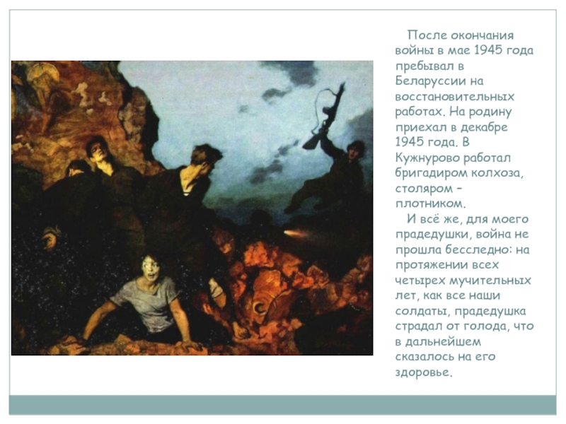 Слайд 10После окончания войны в мае 1945 года пребывал в Беларуссии