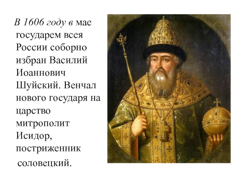 соборно избран Василий Иоаннович Шуйский. Венчал нового государя на царство