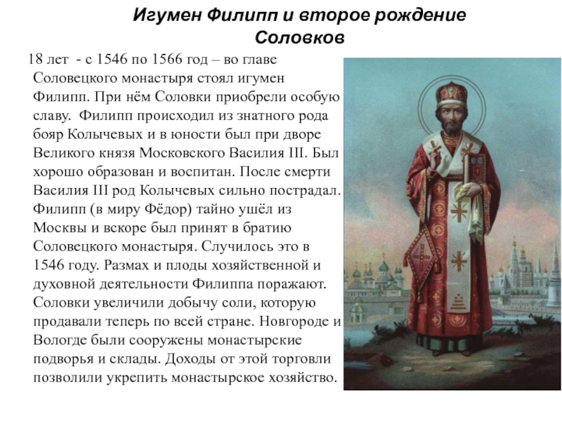 монастыря стоял игумен Филипп. При нём Соловки приобрели особую славу. Филипп происходил из знатного рода бояр Колычевых и в юности был при дворе Великого князя Московского Василия III. Был хорошо образован и воспитан. После смерти Василия III род Колычевых сильно пострадал. Филипп (в миру Фёдор) тайно ушёл из Москвы и вскоре был принят в братию Соловецкого монастыря. Случилось это в 1546 году. Размах и плоды хозяйственной и духовной деятельности Филиппа поражают. Соловки увеличили добычу соли, которую продавали теперь по всей стране. Новгороде и Вологде были сооружены монастырские подворья и склады. Доходы от этой торговли позволили укрепить монастырское хозяйство.