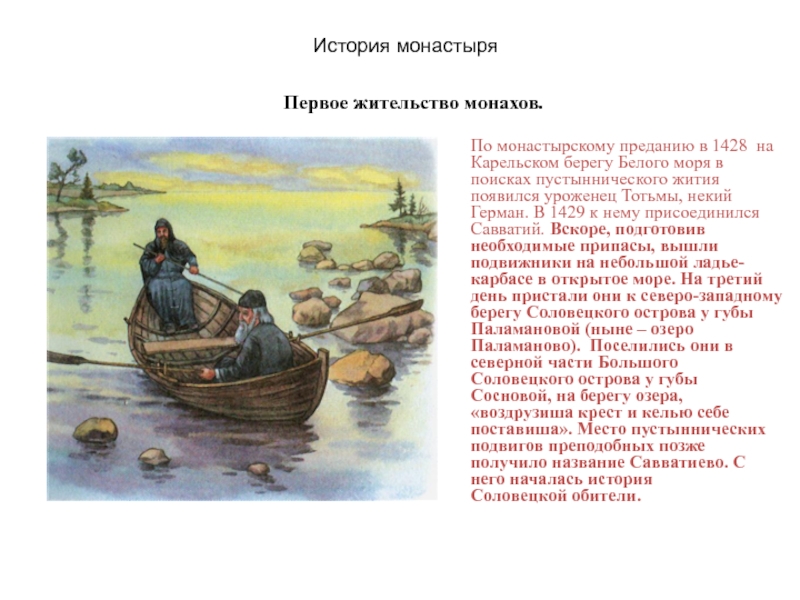 1429 к нему присоединился Савватий. Вскоре, подготовив необходимые припасы, вышли подвижники на небольшой ладье-карбасе в открытое море. На третий день пристали они к северо-западному берегу Соловецкого острова у губы Паламановой (ныне – озеро Паламаново). Поселились они в северной части Большого Соловецкого острова у губы Сосновой, на берегу озера, «воздрузиша крест и келью себе поставиша». Место пустыннических подвигов преподобных позже получило название Савватиево. С него началась история Соловецкой обители.