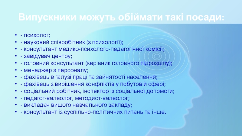 Для ведення ефективної професійної діяльності спеціалісти за фахом “Психологія” повинні володіти навичками консультативної роботи, психологічної діагностики, проведенням психологічної корекції клієнтам різних вікових категорій, соціальним та професійним групам.