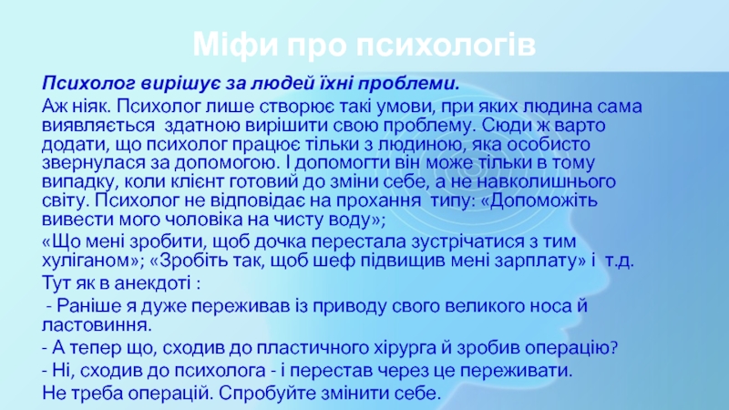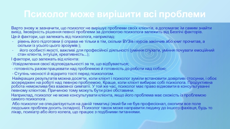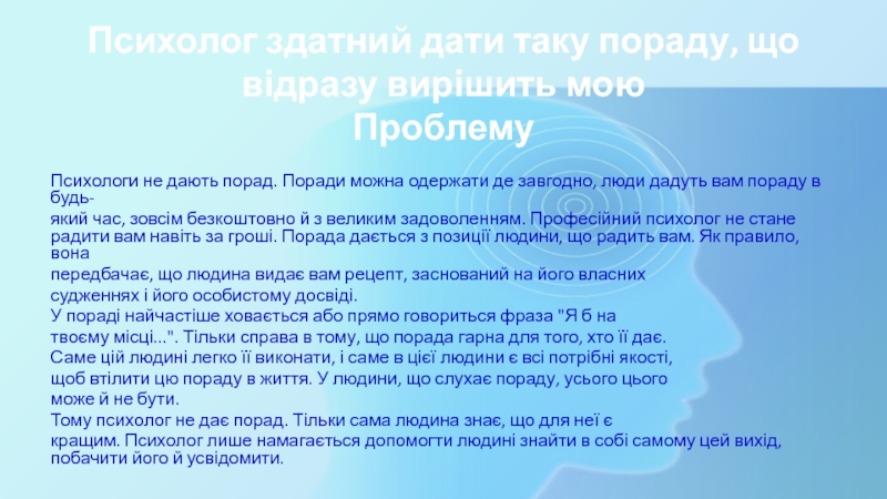 Слайд 14Психолог здатний дати таку пораду, що відразу вирішить мою