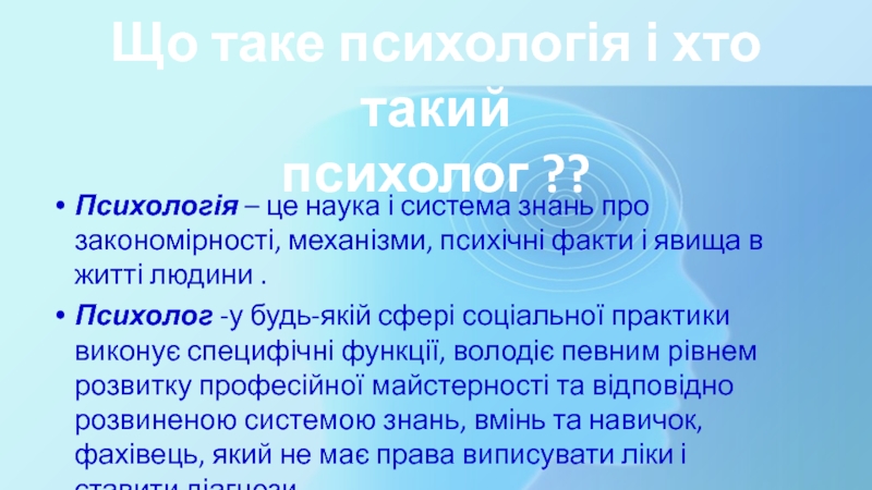 Психолог -у будь-якій сфері соціальної практики виконує специфічні функції, володіє певним рівнем розвитку професійної майстерності та відповідно розвиненою системою знань, вмінь та навичок, фахівець, який не має права виписувати ліки і ставити діагнози.