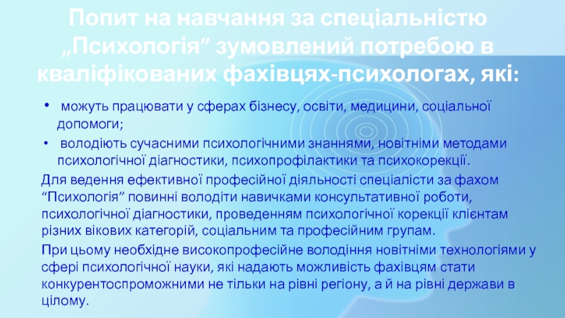 Слайд 5Попит на навчання за спеціальністю „Психологія” зумовлений потребою в кваліфікованих