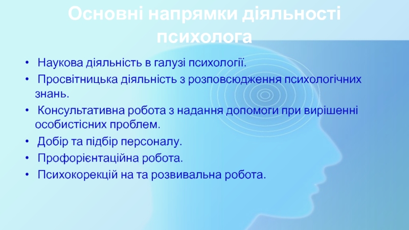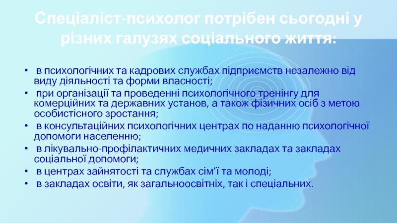 Слайд 6Спеціаліст-психолог потрібен сьогодні у різних галузях соціального життя:
