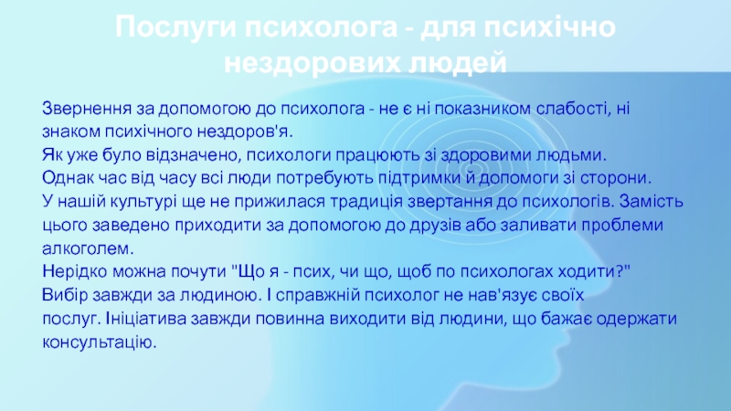 Слайд 13Послуги психолога - для психічно нездорових людей