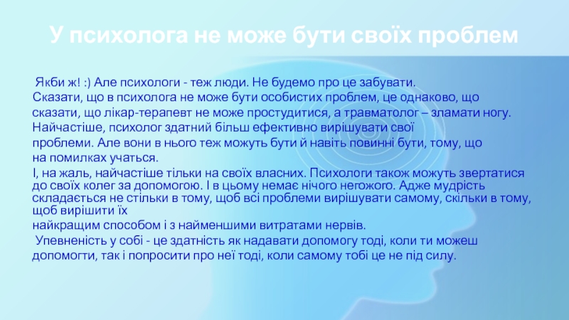 І, на жаль, найчастіше тільки на своїх власних. Психологи також можуть звертатися до своїх колег за допомогою. І в цьому немає нічого негожого. Адже мудрість складається не стільки в тому, щоб всі проблеми вирішувати самому, скільки в тому, щоб вирішити їх