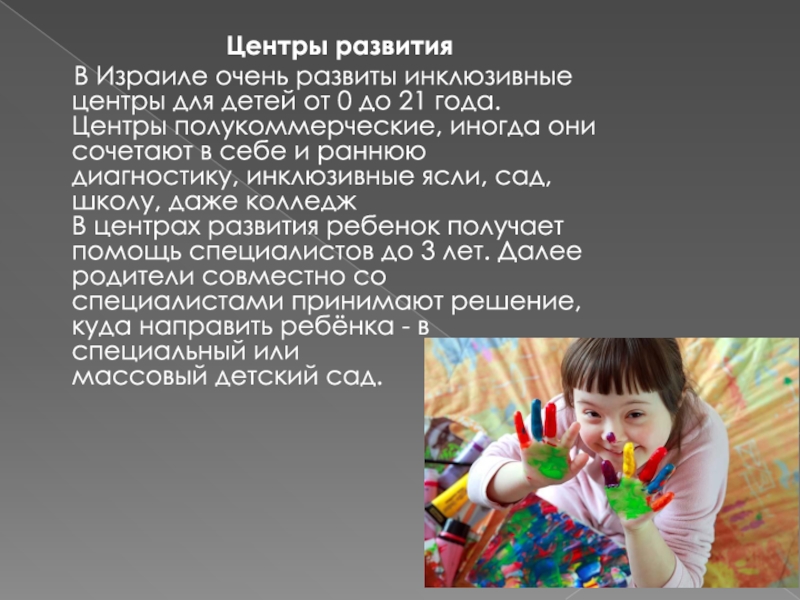 инклюзивные центры для детей от 0 до 21 года. Центры полукоммерческие, иногда они сочетают в себе и раннюю диагностику, инклюзивные ясли, сад, школу, даже колледж В центрах развития ребенок получает помощь специалистов до 3 лет. Далее родители совместно со специалистами принимают решение, куда направить ребёнка - в специальный или массовый детский сад.