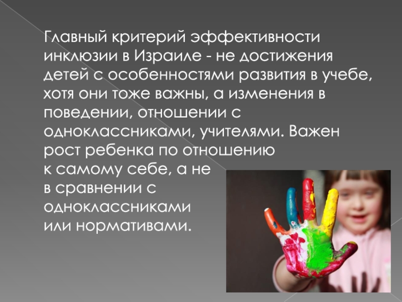 Слайд 7 Главный критерий эффективности инклюзии в Израиле - не