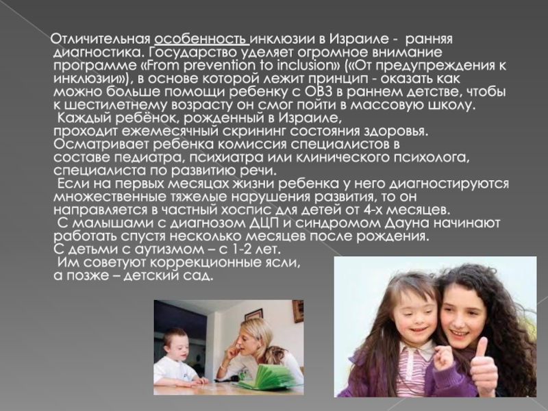 Слайд 3 Отличительная особенность инклюзии в Израиле -  ранняя диагностика. Государство
