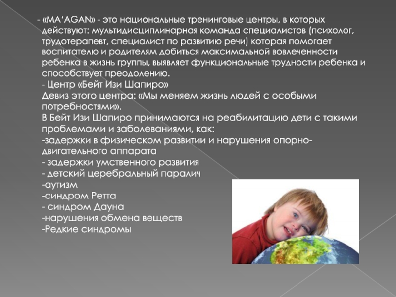 развитию речи) которая помогает воспитателю и родителям добиться максимальной вовлеченности ребенка в жизнь группы, выявляет функциональные трудности ребенка и способствует преодолению. - Центр «Бейт Изи Шапиро» Девиз этого центра: «Мы меняем жизнь людей с особыми потребностями». В Бейт Изи Шапиро принимаются на реабилитацию дети с такими проблемами и заболеваниями, как: -задержки в физическом развитии и нарушения опорно-двигательного аппарата - задержки умственного развития - детский церебральный паралич -аутизм -синдром Ретта - синдром Дауна -нарушения обмена веществ -Редкие синдромы