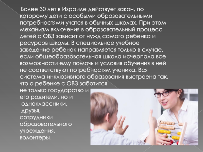 Более 30 лет в Израиле действует закон, по которому дети с особыми образовательными потребностями учатся в обычных школах. При этом механизм включения в образовательный процесс детей с ОВЗ зависит