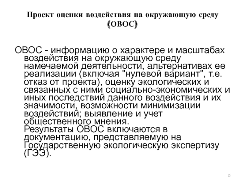 Слайд 5Проект оценки воздействия на окружающую среду (ОВОС)