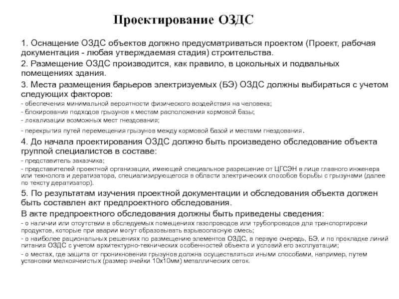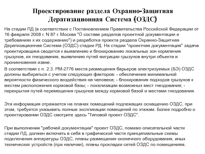 N 87 г. Москва "О составе разделов проектной документации и требованиях к их содержанию") и разработка проекта раздела Охранно-Защитная Дератизационная Система (ОЗДС) стадии РД. На стадии "проектная документация" задача проектировщика сводится к выявлению и блокированию локальных зон кормления грызунов, их гнездования, выявлению путей миграции грызунов внутри объекта и проникновения извне.