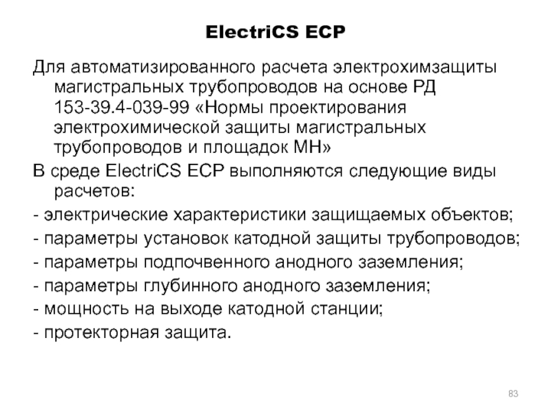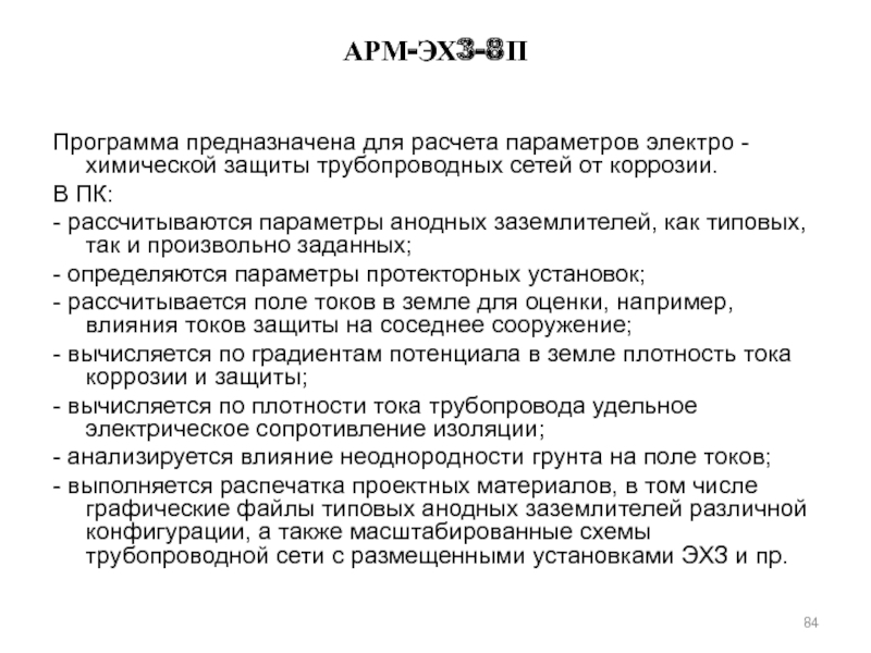 Программа предназначена для расчета параметров электро - химической защиты трубопроводных