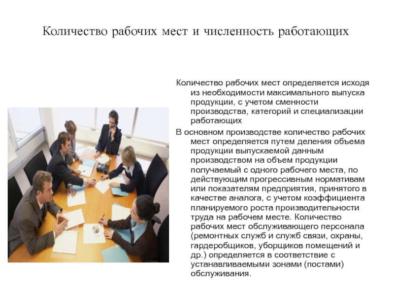 В основном производстве количество рабочих мест определяется путем деления объема продукции выпускаемой данным производством на объем продукции получаемый с одного рабочего места, по действующим прогрессивным нормативам или показателям предприятия, принятого в качестве аналога, с учетом коэффициента планируемого роста производительности труда на рабочем месте. Количество рабочих мест обслуживающего персонала (ремонтных служб и служб связи, охраны, гардеробщиков, уборщиков помещений и др.) определяется в соответствие с устанавливаемыми зонами (постами) обслуживания.
