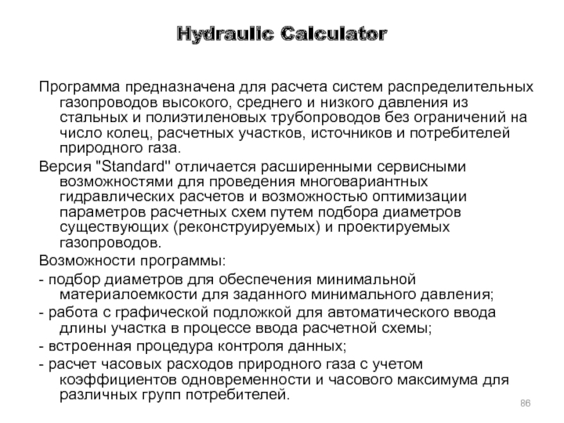Программа предназначена для расчета систем распределительных газопроводов высокого, среднего