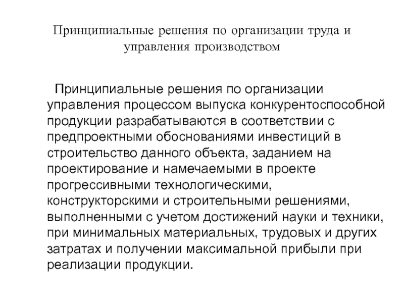 Слайд 15Принципиальные решения по организации труда и управления производством