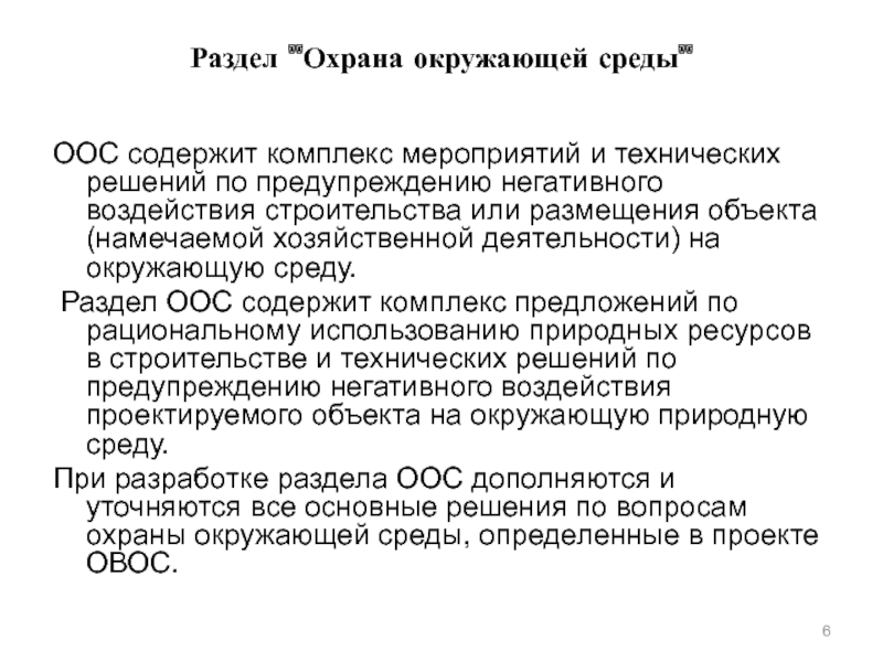 При разработке раздела ООС дополняются и уточняются все основные решения по вопросам охраны окружающей среды, определенные в проекте ОВОС.