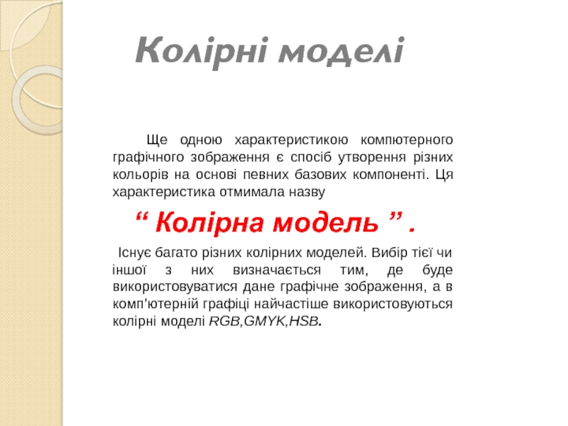 Існує багато різних колірних моделей. Вибір тієї чи іншої з них визначається тим, де буде використовуватися дане графічне зображення, а в комп’ютерній графіці найчастіше використовуються колірні моделі RGB,GMYK,HSB.